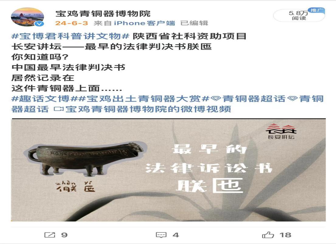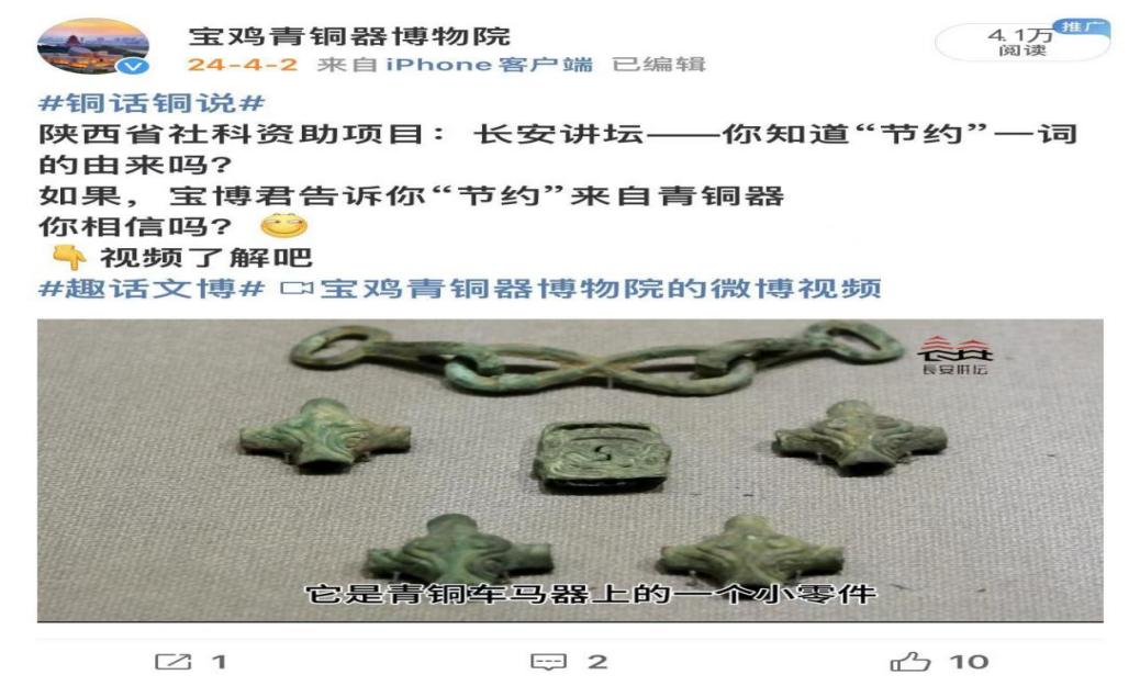 (2)、新媒体拓展科普宣传的覆盖面。我院利用官方媒体进行线上视频宣传,提高了科普知晓率,从科普视角引领观众了解文物保护和青铜器。