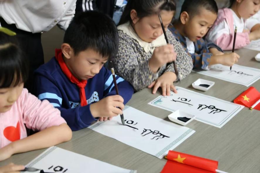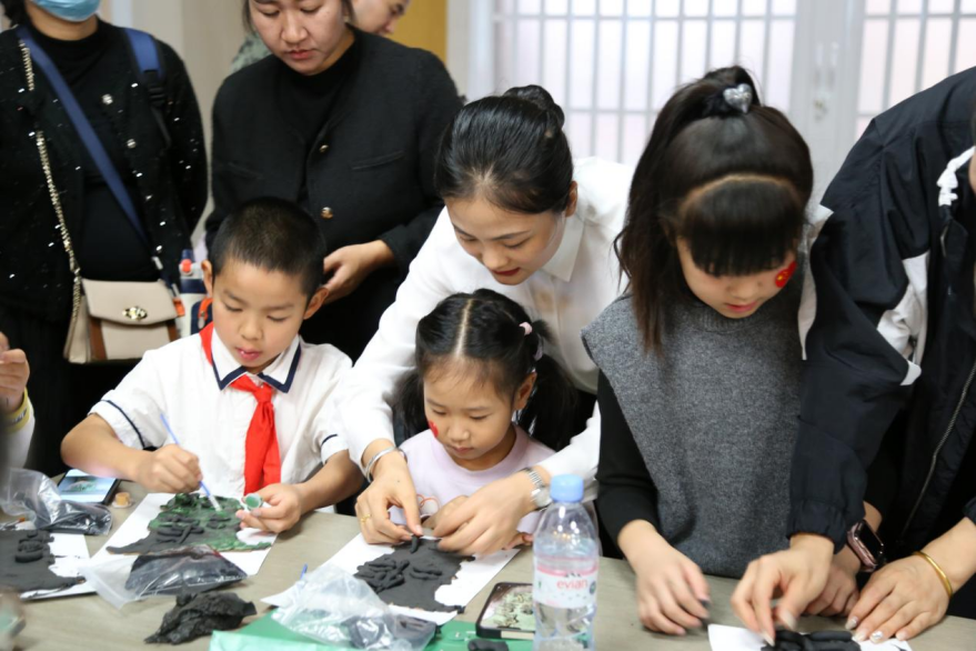 讲座结束后,为进一步深化青少年的文化认知和爱国情怀,教育员为来院青少年开展“写金文——文物里的中国”、“传爱国精神 担爱国使命”、“笺上情浓 共贺国庆”、“铜趣古金—编钟浮雕画”等7场社教活动,通过创作何尊、“青铜爵”的浮雕画、书写金文等一系列丰富多彩的活动,使青少年在活动中深刻感受到了中华传统文化的博大精深和独特魅力。