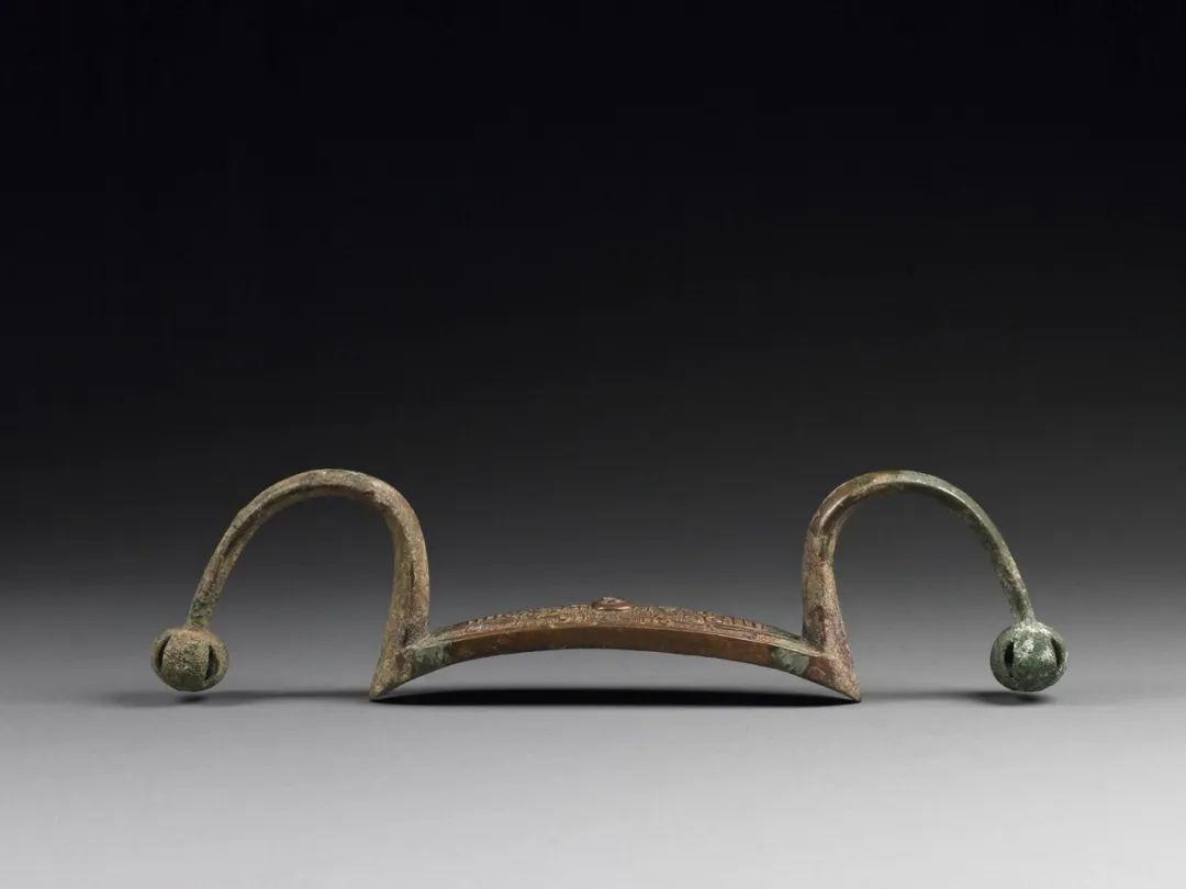 弓形,器身内壁凹下,上有三道脊棱,脊部隆起,中心处有一圆突,两侧饰对称粗阳线勾勒的蝉纹,细密云雷纹衬地,弓身两端伸出连弧状曲臂,臂端有镂空小铃,内含弹丸。臂身连接处两端均有明显捆缚痕迹。弓形器背部装饰的蝉纹两两相对,双目、口部、腹部、前肢、翼部均有刻画,两端镂空小铃的清脆铃声似乎是两蝉的鸣叫之声。