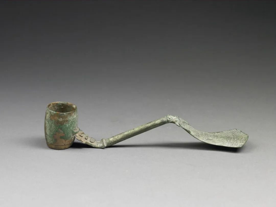 斗为舀酒器,此斗的柄部装饰一蝉纹,蝉纹清晰,蝉的头部、翼部、腹部、足部均有表现,虽由阴线刻画,但形象生动,似乎一只俯身吸吮的蝉跃然于前。与西周司卣上的蝉纹相比,此蝉纹的翼部线条较为舒展,可能是装饰空间较大,不似提梁表面狭窄。除了在礼器上装饰蝉纹以外,它也出现在兵器及车马器中。