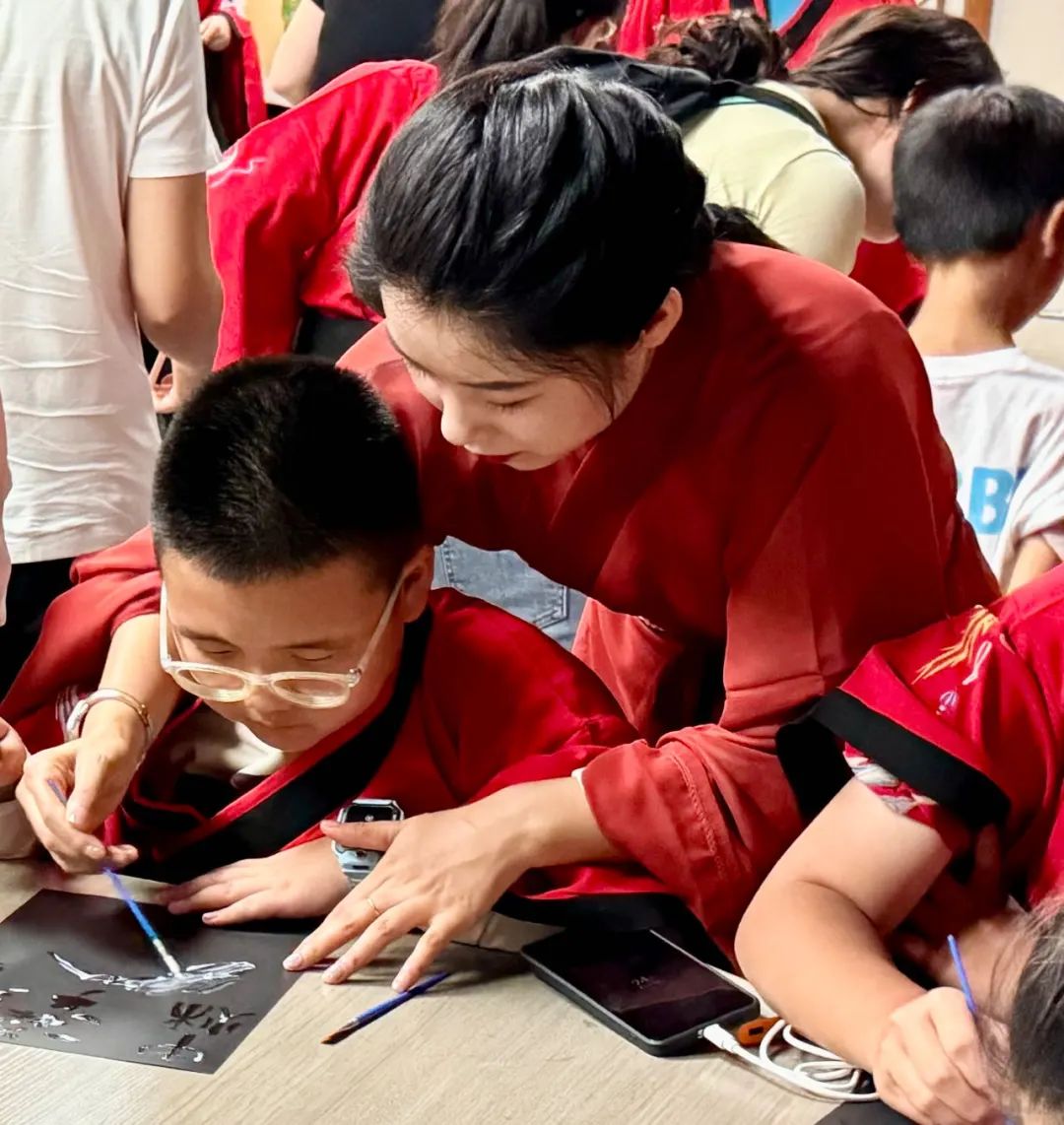 “中秋金箔画”则以闪耀的金箔为中秋元素。大家用心勾勒,将对中秋的美好祝愿融入每一笔线条、每一片金箔之中。无论是绘制象征团圆的满月、活泼可爱的玉兔,还是寓意丰收的果实,小朋友们都亲手制作属于自己的中秋金箔画。