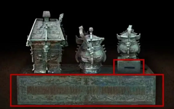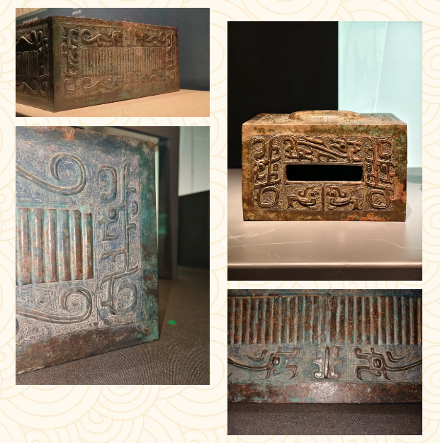 在 ,珍藏着一件带有龙纹的青铜器——夔龙纹禁。禁是古代祭祀、宴飨时用来盛放酒器的案几。这件夔龙纹禁为长方形,造型规整,简洁大方。禁面四周装饰有12个双头龙纹,龙头上有花冠自然下垂,两个龙头回首对视,身体上下各有一爪。禁的四周装饰有一圈爬行龙纹,长长的龙身舒展着向前爬行,龙口微张,龙尾向上卷起,有一角一足,龙纹对称排列,两两相对。