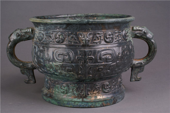 簋是商周青铜器中重要的食器。两件簋形制、纹饰、铭文皆相同。簋圆口微侈,敛颈,鼓腹较深,两兽耳有珥,高圈足。颈部及足部饰由折身回首夔龙纹及圆涡纹相间组成的纹饰带。腹部饰兽面纹,兽面两侧均有一夔龙装饰。通体无地纹,纹饰整体呈浮雕状。簋底部铸有铭文“乍(作)宝彝”。