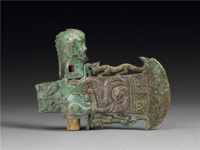 兵器。该钺体呈长方形,舌形刃较宽,刃部可见磨损痕迹。带銎,銎两端出齿作两肩,长方形直内,近刃部饰对称两兽头,本部饰蛇纹,本两侧圆雕回首立虎,内部两侧饰蛇纹,蛇身屈于銎口之上,銎上齿端接有人头,人头中空,内有木柲和钺身相连,人首方脸,额前有刘海,脑后有发辫,八个发辫节清晰可见,人首面部形态憨厚、朴实,其颈部两侧有方孔固柲,銎内残存有木柲,柲上有一长方形铆孔,铆孔内留有木榫头,榫头内夹一段木楔。该件人头銎内钺为商周时期兵器之精品。