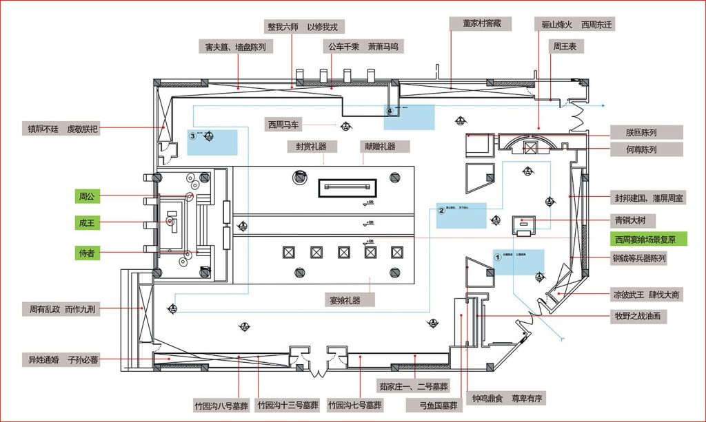 周王朝文化的核心是其礼仪制度,第二展厅以对周礼的追溯和阐释为线索,以寓意周人宗法制的青铜树为开篇,阐明宗法礼制中的大宗、小宗的含义。展厅面积947平方米,共展出文物688件。以方正分隔板块,以西周殿堂为中心,四周分陈西周的创立和周礼的各个方面,厉王胡簋、墙盘、何尊等珍品散落其中,虚实之间,向人展示周公礼制下的钟鸣鼎食、尊卑有序的主流社会生活形态。