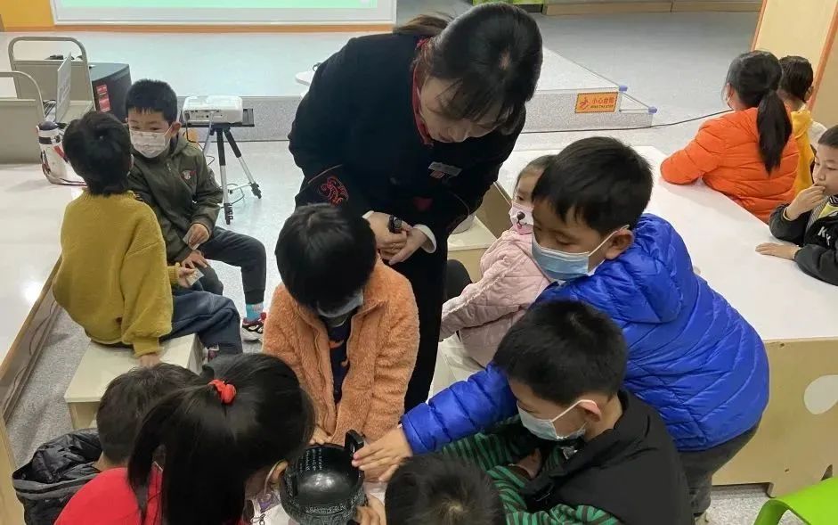 宣讲队老师以提问互动的方式教大家认识青铜器,了解青铜器的用途及分类,而且还借助青铜器复制品让孩子们近距离观察和触摸青铜器,感受古代青铜器的分量及纹饰。