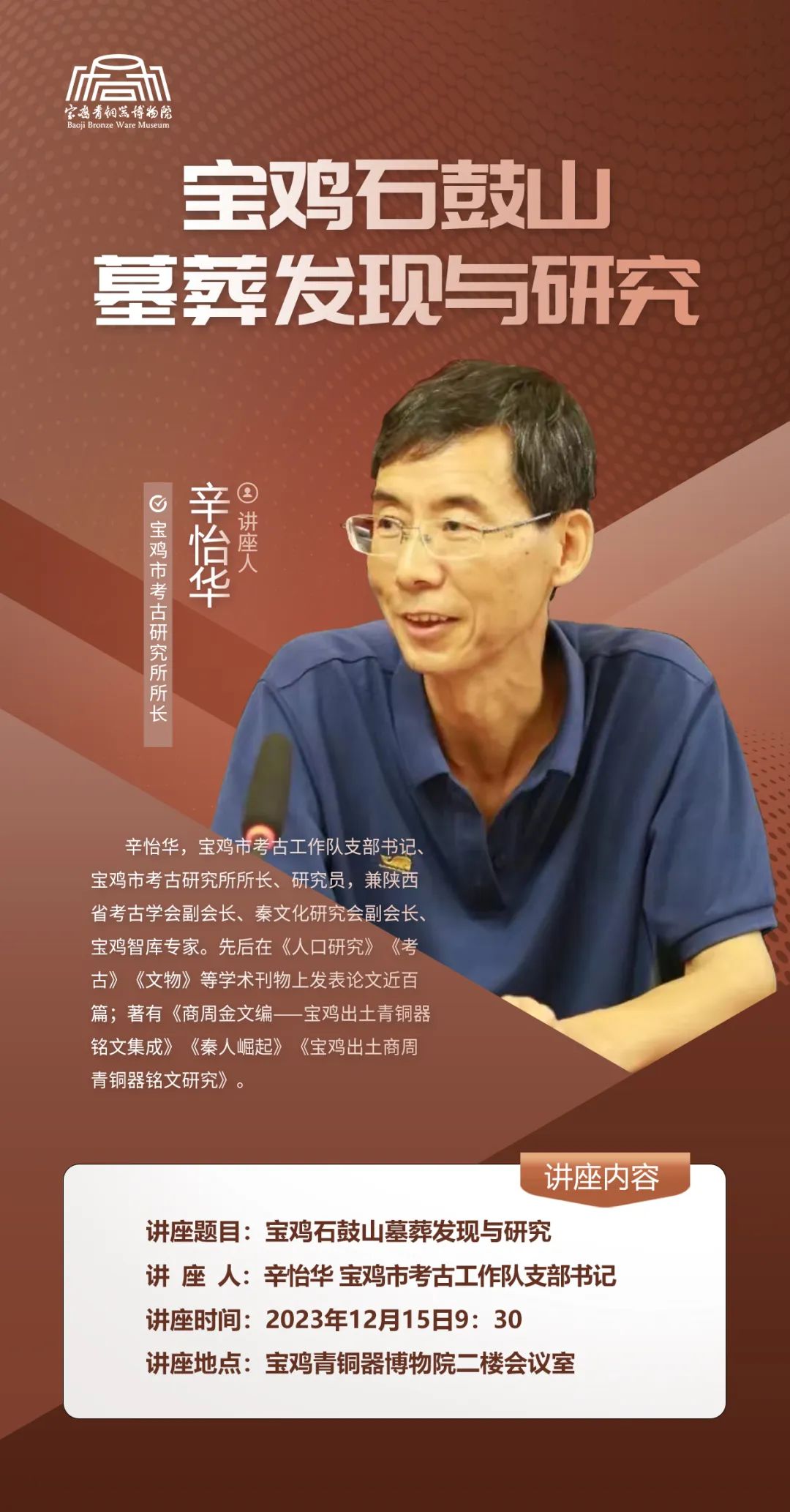 讲座题目:《宝鸡石鼓山墓葬发现与研究》讲座时间:2023年12月15日(星期五)9:30