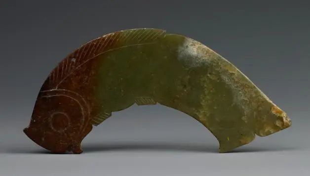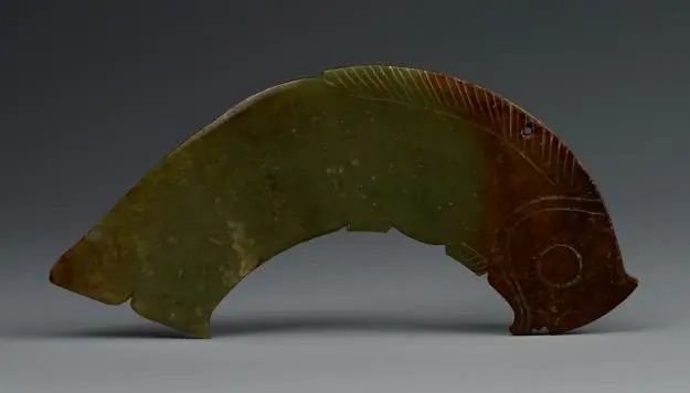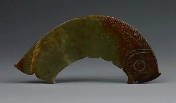 国墓地出土。长11.4厘米,宽3.2厘米,厚0.15厘米,重0.022千克。青玉质,墨绿色,头端为红褐色,玉质晶莹,鲜润透明。鱼呈圆弧状,宽单阴线刻划鱼目、鳃,细单阴线刻划鳍,鳍部有一双向打孔的穿。该器与同墓出土的西周玉鱼(乙)为一对,玉质,器形完全相同,应是对开成型工艺,是我们研究西周玉器加工工艺的可靠资料。