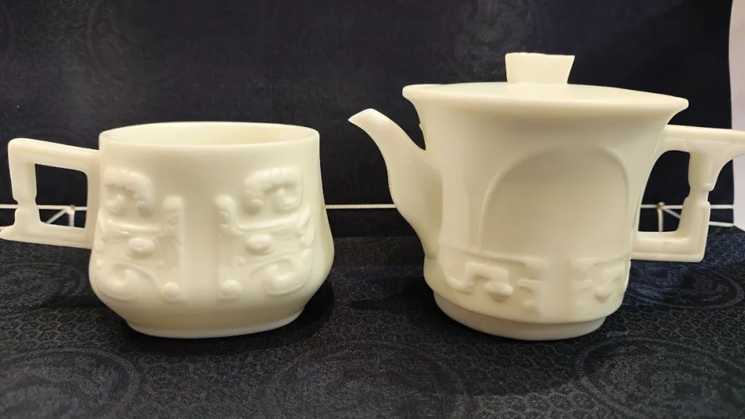 材质上选用了羊脂玉瓷这种更为细腻的材质。这是白瓷中的极品,以其浅米色、温润光泽、极低成品率彰显其稀缺和珍贵。这也是我们对“何尊”的敬意。金玉良缘,玉瓷让吉金更有温度。