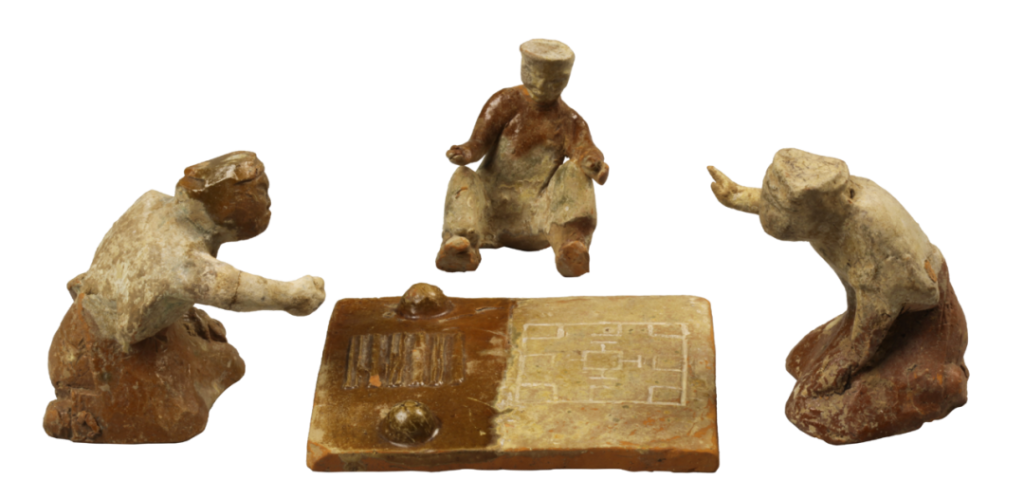 现藏于洛阳龙门博物馆的六博戏陶塑,生动的展现了古人博戏的场景:下棋者席地跪坐,神态专注,二人表情生动形象;观棋者随意而坐,兴趣盎然;棋盘刻画简洁明了。整个画面生动逼真,宛如情景再现。