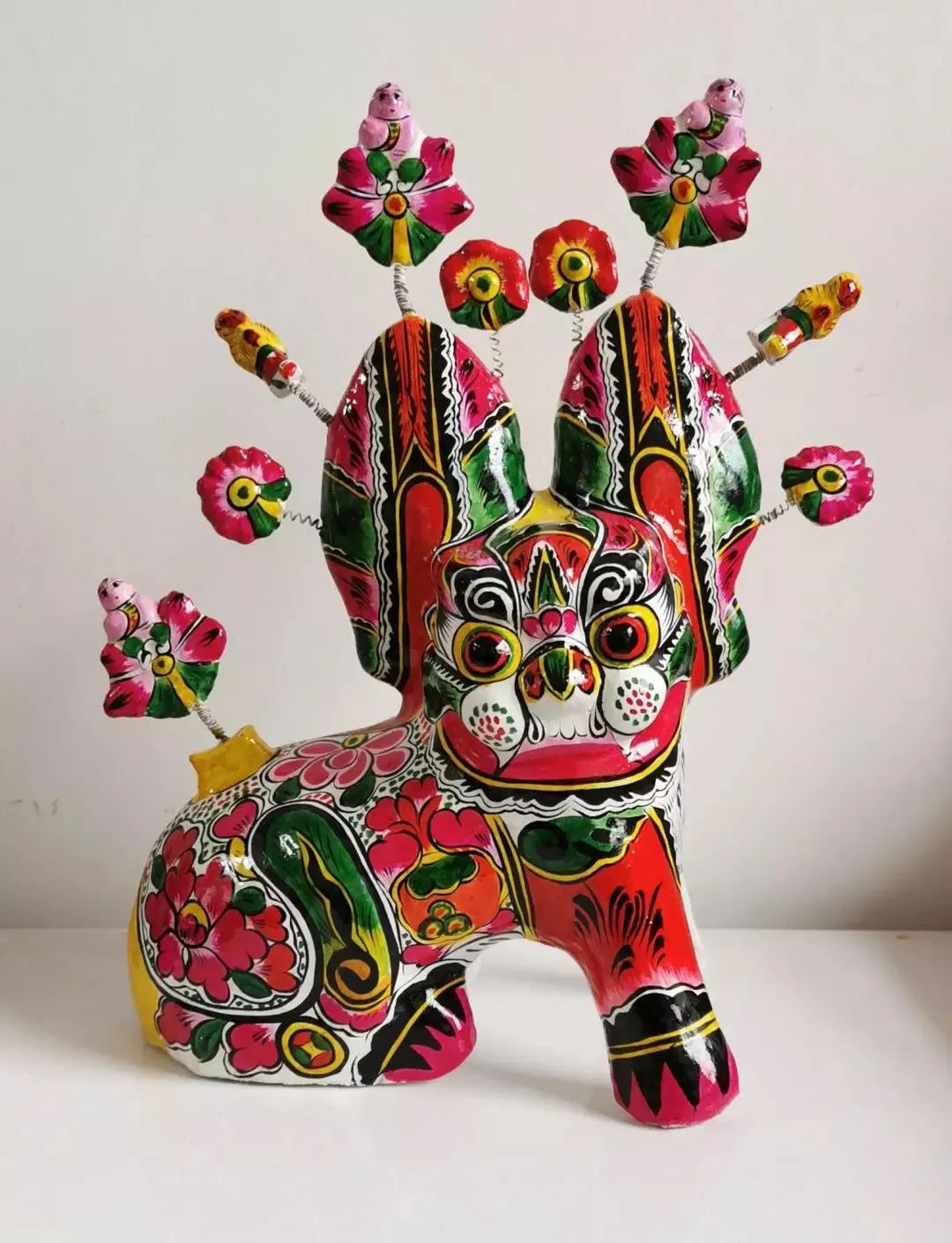 “他”呈蹲坐状,身穿红、黄、绿三色组成的华丽服饰。圆圆的脑袋高高的抬起,两只眼睛瞪得滚圆,大大的耳朵直愣愣的立着,仿佛在小心的警惕四周的动静,耳朵上还开出了小花,一动就会晃个不停,显得十分可爱。“他”就是铜虎君新认识的小伙伴——凤翔泥塑坐虎,人们相信“他”具有祛恶辟邪的本事。坐虎的大家庭中还有挂虎,挂虎是一种浮雕出老虎面部的泥塑,重点突出了威风凛凛的神情。